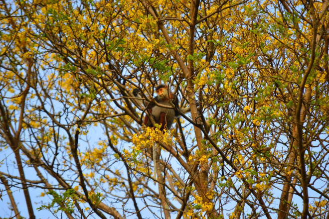 Hàng cây vàng rực nằm sát ven đường là địa điểm quan sát voọc chà vá chân nâu lí tưởng nhất dành cho du khách khi đến bán đảo Sơn Trà.
